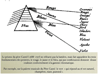 On peut lire en page 30 de l’ouvrage Des Sons et des Couleurs, de Charles Blanc-Gatti que le clavecin oculaire permet, selon le Père Castel, « par un jeu de lumières colorées une accentuation de “l’extase” provoquée par la musique. »